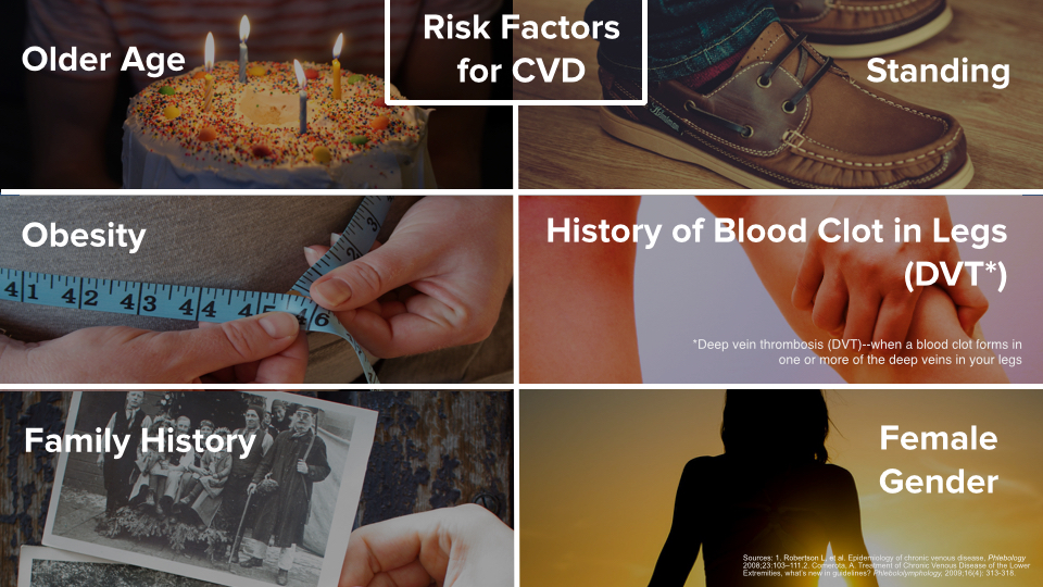 Blood clots, obesity, smoking, muscle weakness, leg injury, and other risk factors can cause vein damage. Sitting or standing for a long time without moving can also cause problems in the leg veins. Symptoms of CVD include heavy legs, aching, swelling, discoloration of the skin and chronic hemorrhoids. Severe cases of CVD can lead to ulcers and deep vein thrombosis.